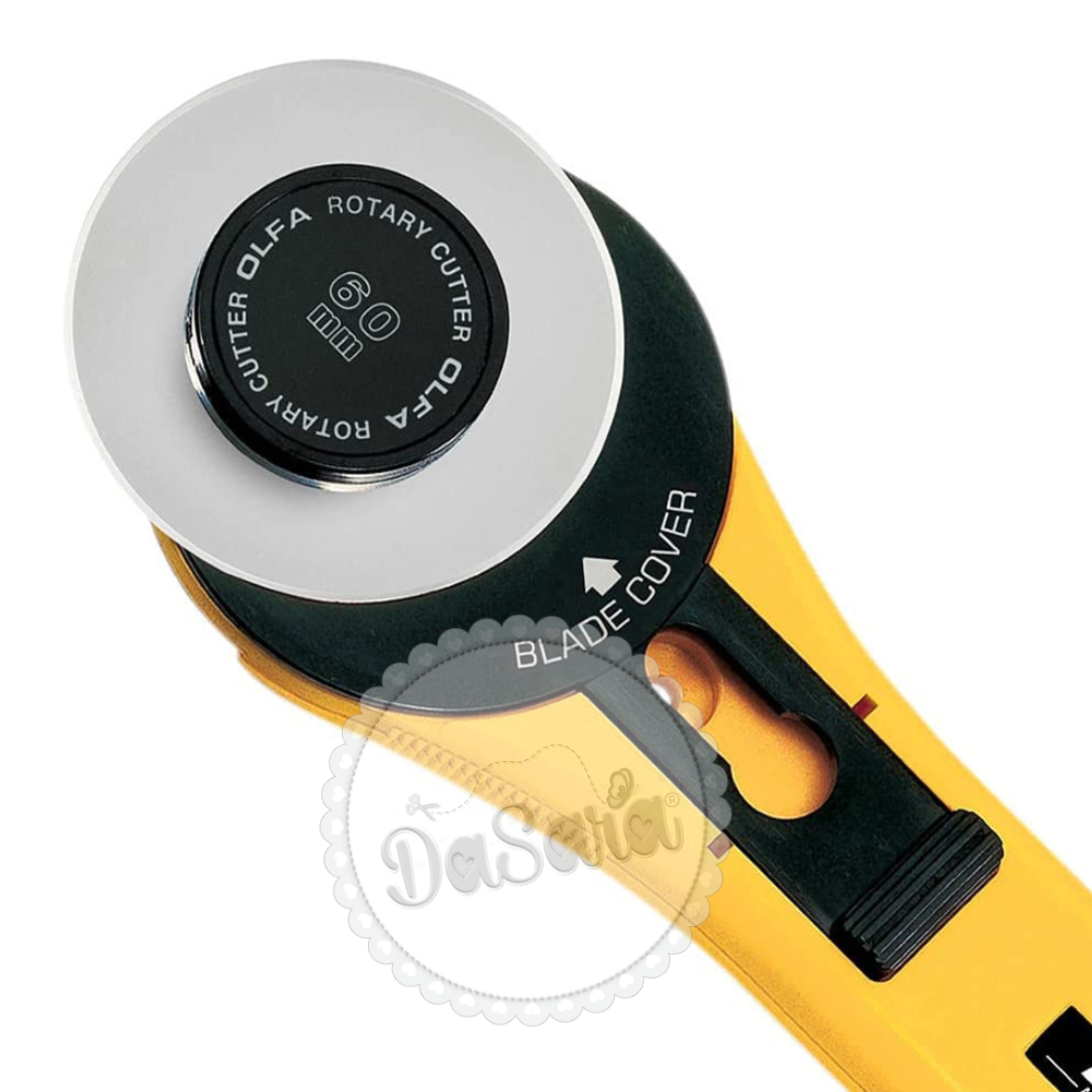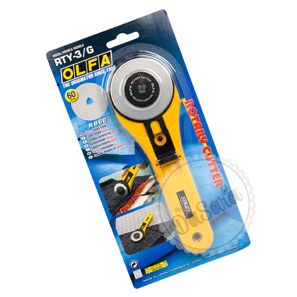 Cortador Rotativo RTY-3/G com a qualidade OLFA®, tem lâmina de 60mm, punho ergonómico e é muito útil para projetos de patchwork, especialmente para cortes longos.