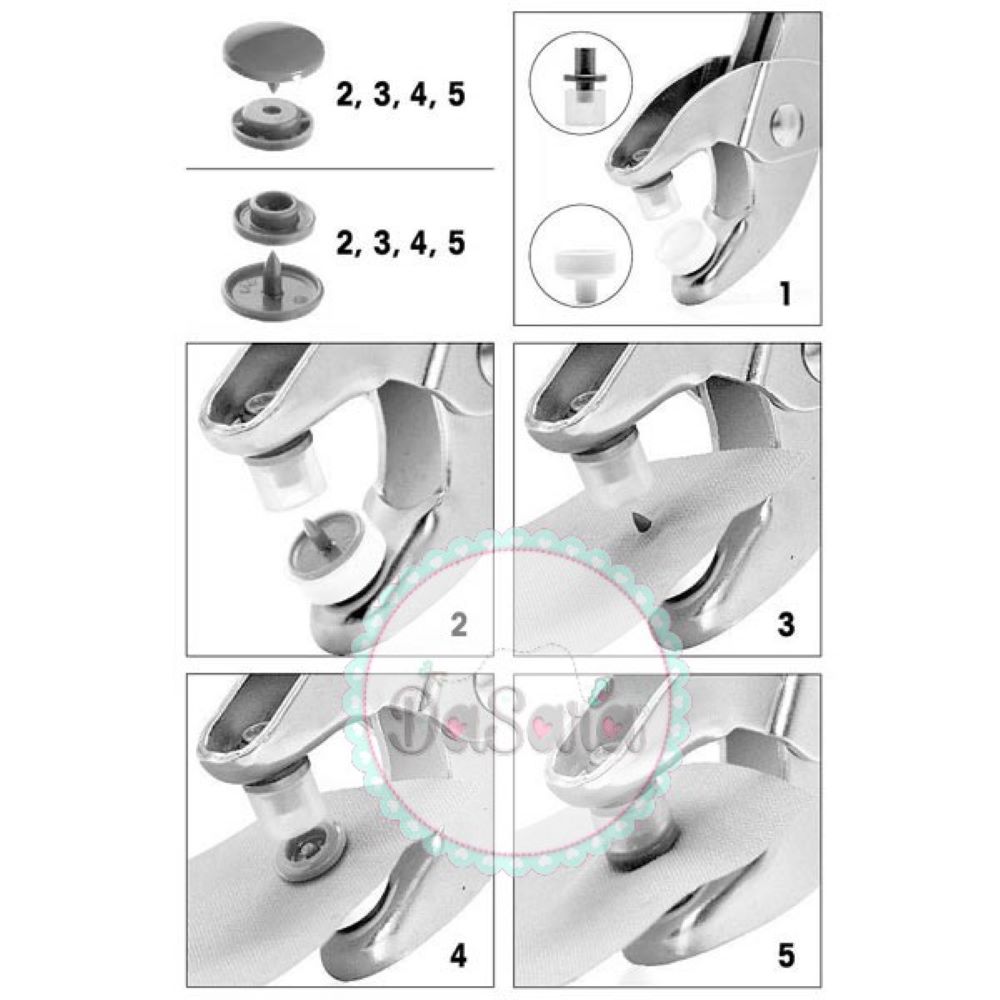 - As molas "Color Snaps" são aplicadas com o alicate Prym e a matriz de ø12,4mm .