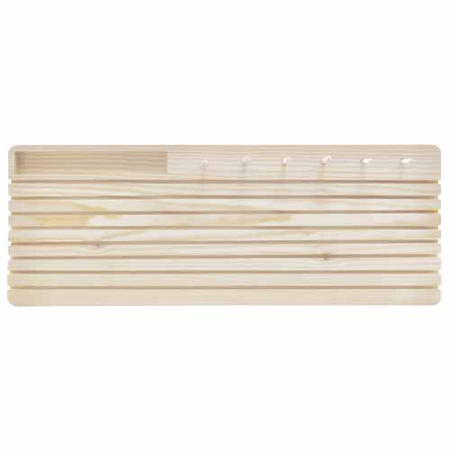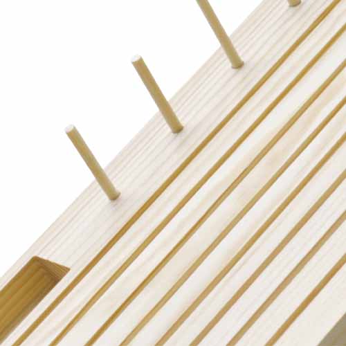 Tem 8 ranhuras para as réguas, 6 pinos de madeira para os carrinhos de linhas e um compartimento onde podes arrumar canelas / bobines. O organizador de Réguas mantém o teu espaço de trabalho arrumado!