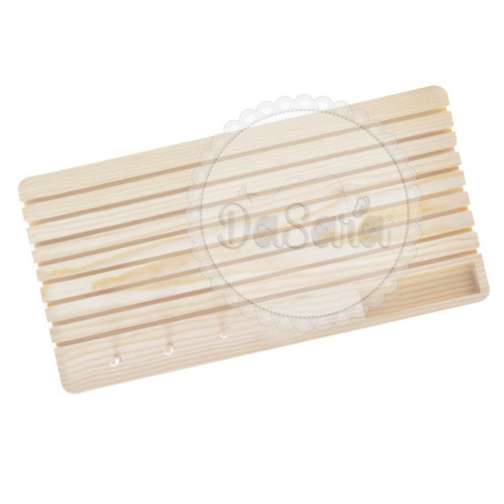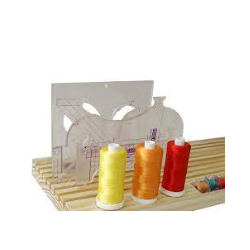O organizador de madeira, além das 8 ranhuras para as réguas, tem 3 pinos para colocar carrinhos de linhas. Também inclui um pequeno compartimento para as canelas / bobines.