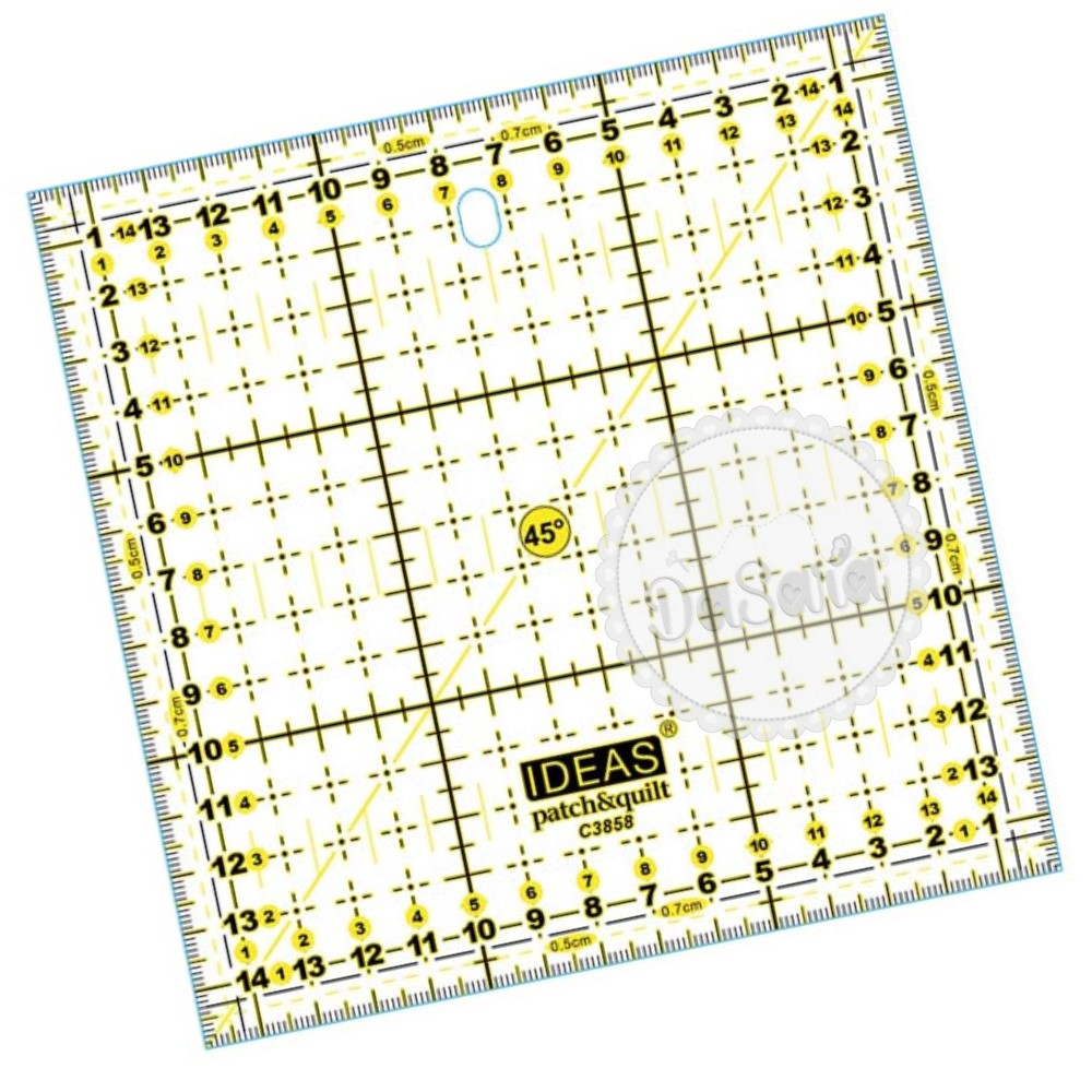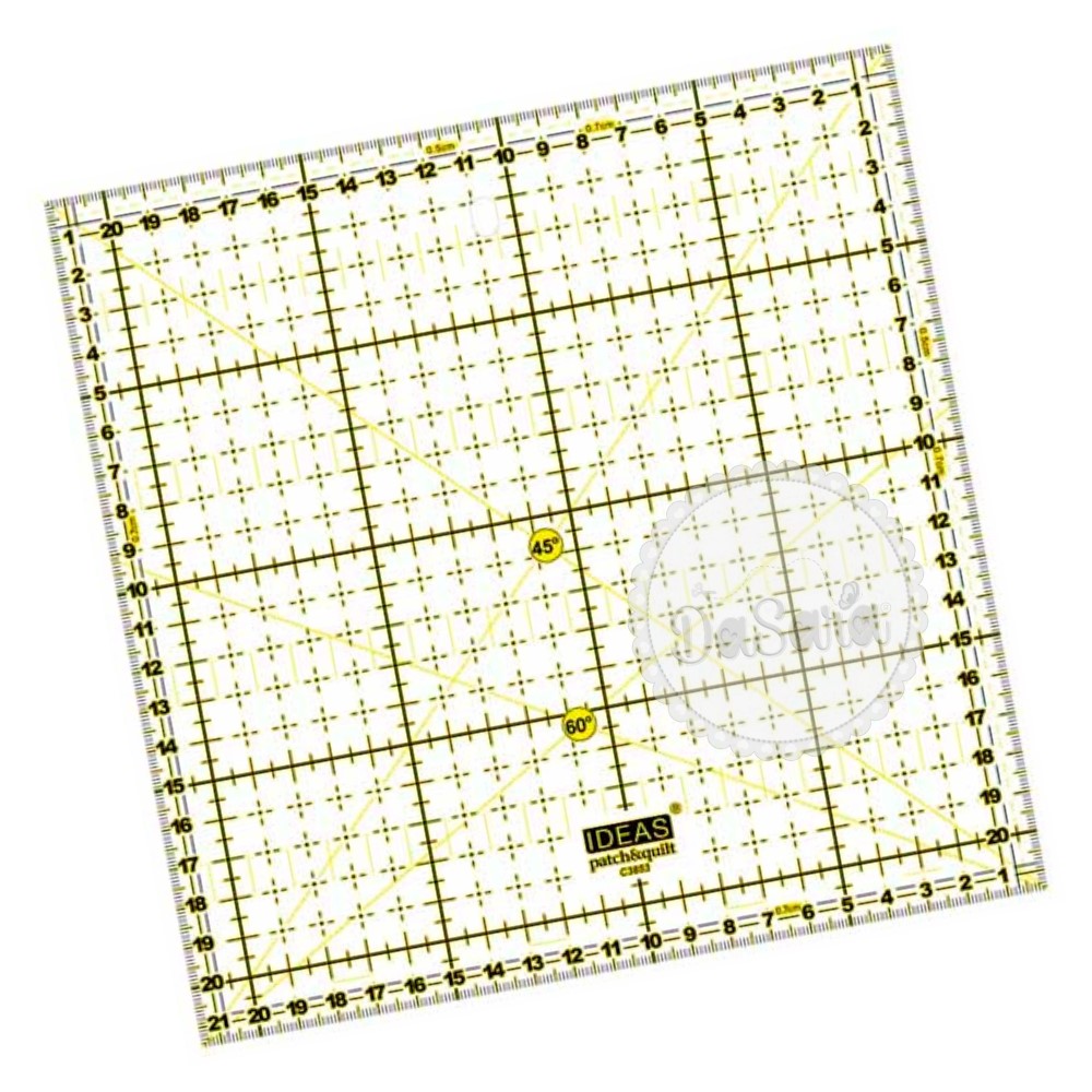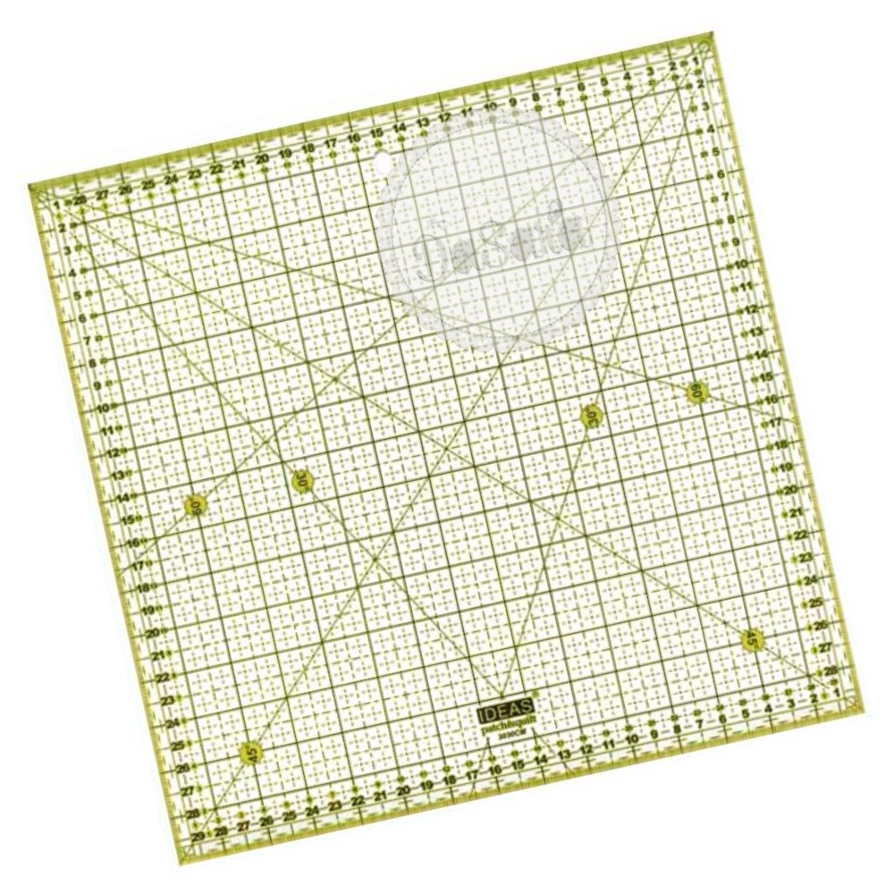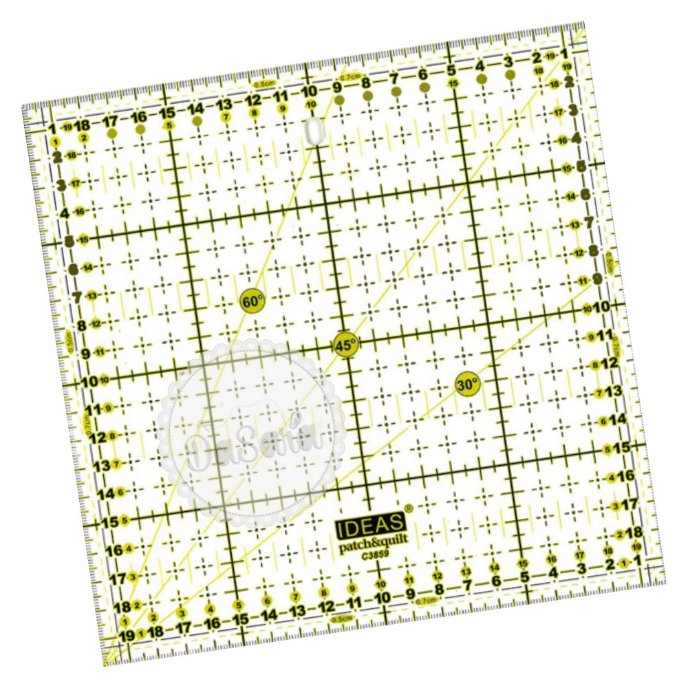 Perfeita para cortar tiras, quadrados e retângulos. Algumas versões da régua também têm marcações de ângulos de 30º, 45º e 60º, para cortar triângulos, estrelas, diamantes e tiras em viés.